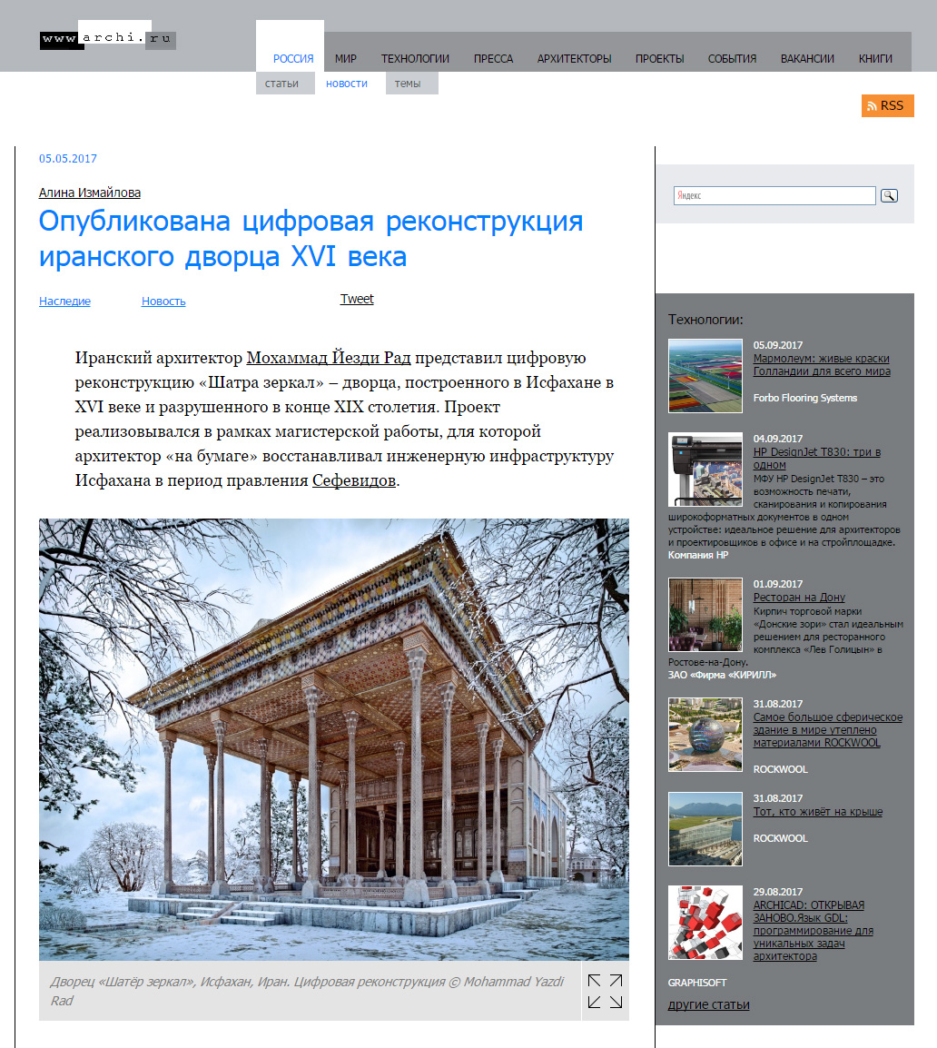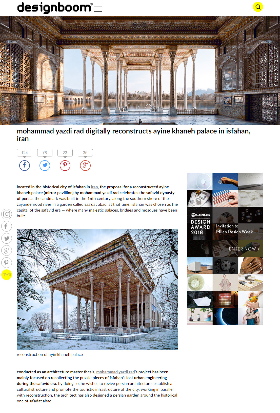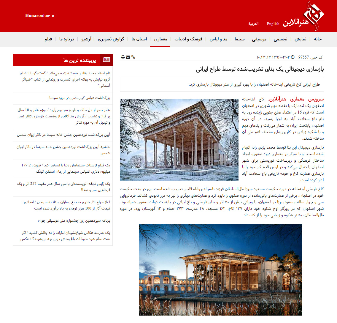– نامزد مسابقه CGArchitect 2017 با پروژه بازآفرینی کاخ آیینه خانه اصفهان