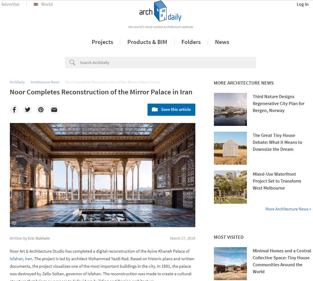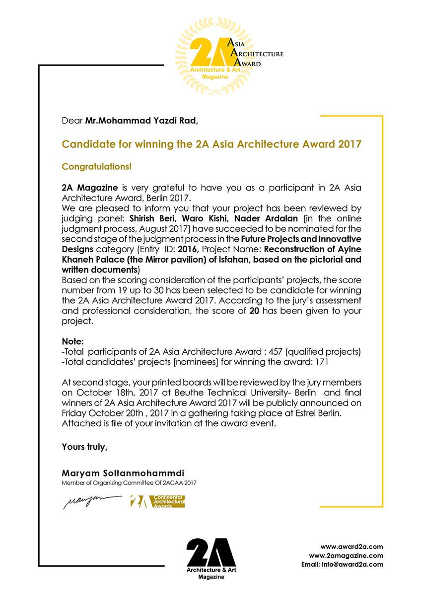 – نامزد جایزه معماری آسیا 2A 2017 با پروژه بازآفرینی کاخ آیینه خانه اصفهان